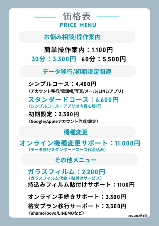 価格改定のお知らせ! お客様各位 平素は、格別のご高配を賜り厚く御礼申し上げます。 この度、スマホアプリの多様化やデータ量の増加などにより、やむなく 2月1日より一部メニューを価格改定を実施させていただきます。 お客様には、ご理解、ご協力の程よろしくお願い申し上げます。